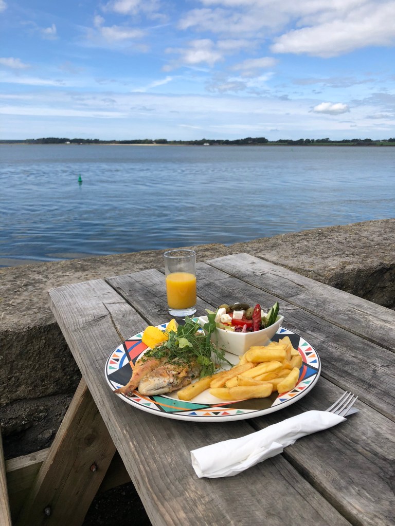 Next day: fish and chip lunch by the water’s edge in Caernarfon, sunshine sparkling on a calm sea.