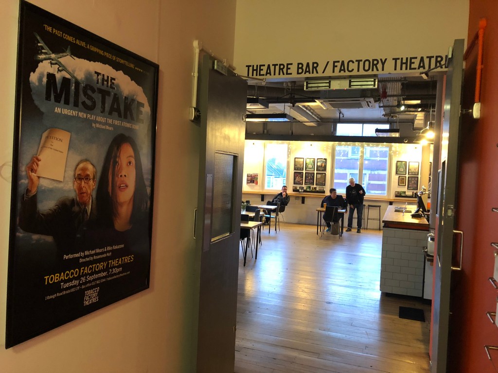 But there is a theatre, and an audience too – who buy drinks and snacks from the ‘pop-up’ bar right next to the stage, which is only closed up seconds before we start the play. I stand in the wings, listening to people laughing, clinking glasses, crunching crisps, and think to myself, this is not going to work – a play about Hiroshima? Here? Now? But work it does. The audience quickly becomes hushed, responding energetically at the end. One man says to us, ‘Hmm. You’ve given me a lot of food for thought. I may have to rethink my views on nuclear weapons.’