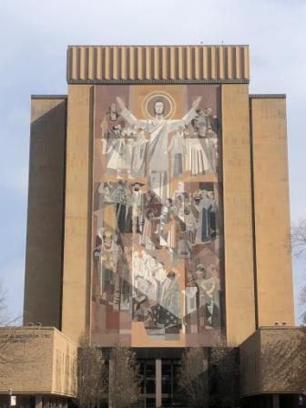I kid you not. Jesus with his arms raised as if signalling a touchdown in American football. The mural is on the north side of the impressive Hesburgh Library – and is visible from the vast Notre Dame stadium nearby. (Sports, religion, sports…)